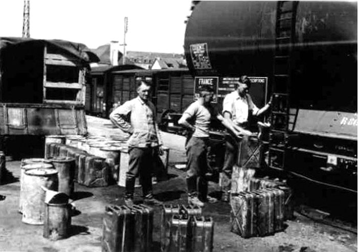 燃料輸送列車からドラム缶とジェリカンに燃料を移す作業を行っている。